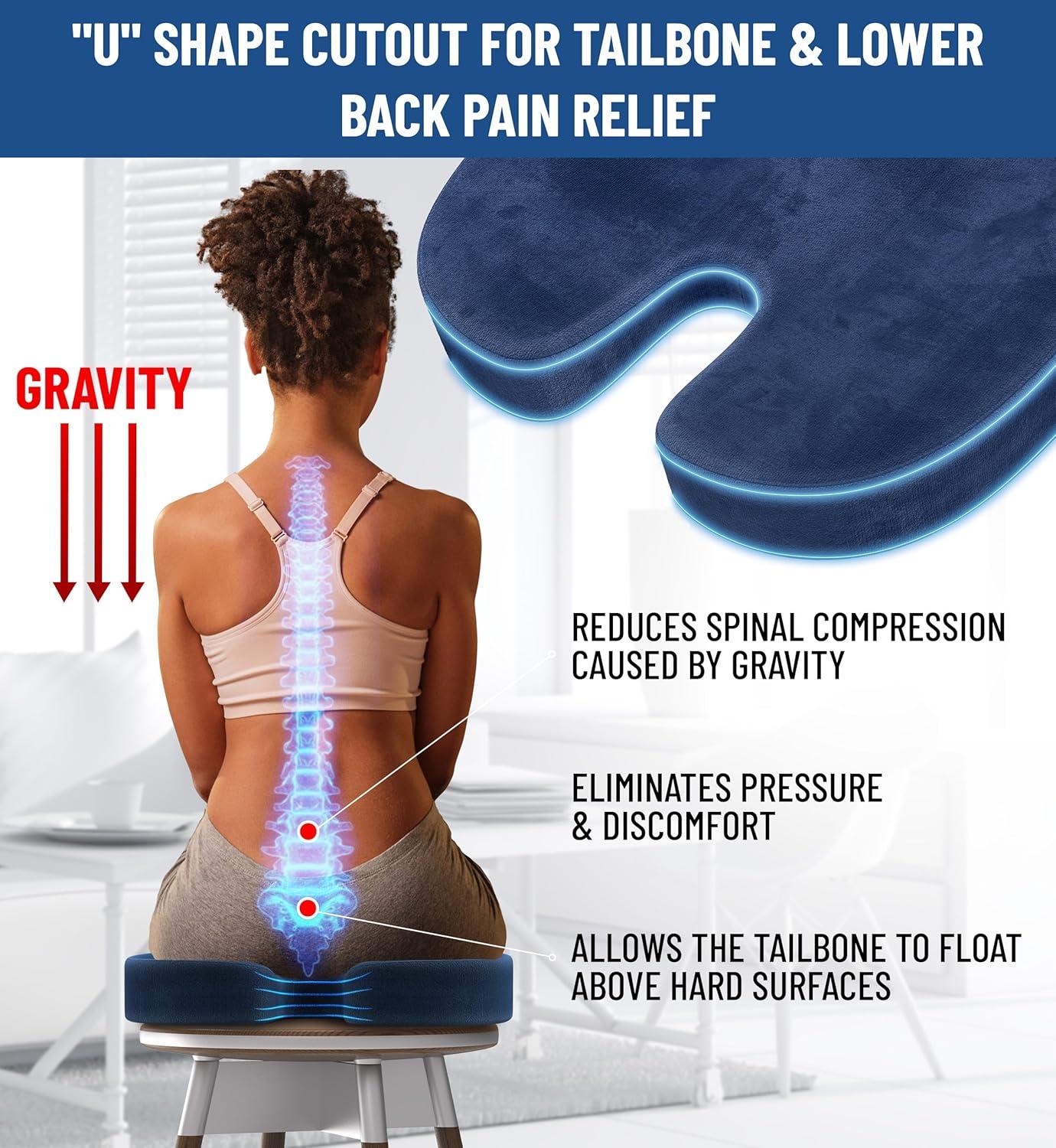 ERGONOMIC SEAT CUSHION FOR OFFICE CHAIR: Our desk chair cushion has a U-shaped coccyx cutout, promoting correct spinal alignment and offering lower back support for office chair use, ultimately relieving back pain