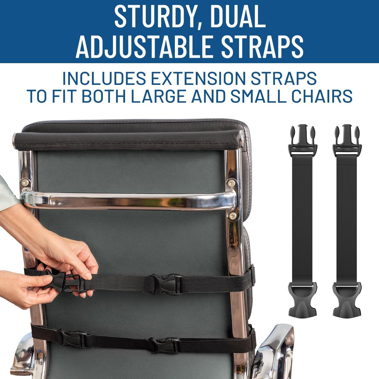 UNIVERSAL FIT OFFICE CHAIR CUSHION: Adjustable straps and extensions fit chairs up to 32″ wide; perfect for office chairs, car seats, wheel chairs, couches, and more; our lower back pillow provides exceptional car back support and couch back support