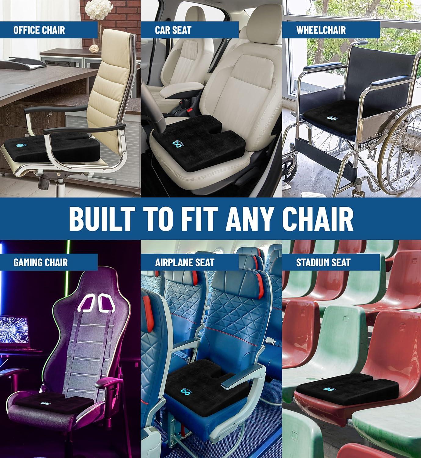 VERSATILE WEDGE CUSHION FOR CHAIR: Use for cars, office chairs, and wheelchairs, our seat wedge cushion adds height and comfort; our driver seat cushion for truck drivers and everyday commuters has the optimal amount of cushion for any long drive