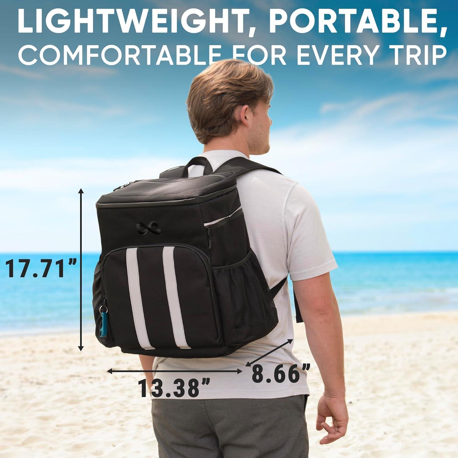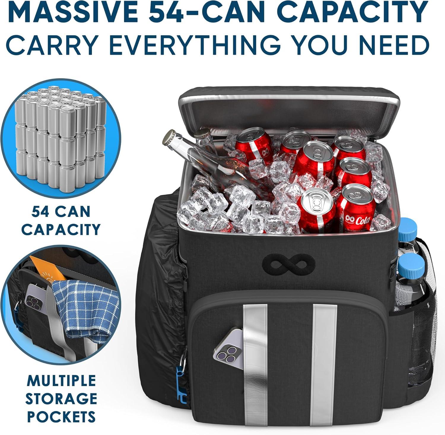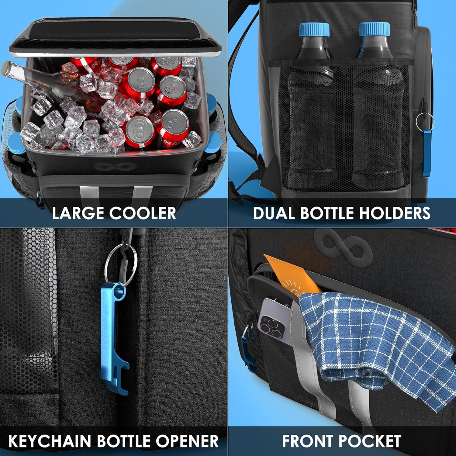 Experience the ultimate in convenience and functionality with the Everlasting Comfort Backpack Beach Cooler Bag. Designed to hold up to 54 cans and 4lb of ice, this beach backpack cooler offers superior storage capacity, making it the perfect companion for beach outings, picnics in the park, and camping trips. An ideal insulated backpack cooler, it keeps your food and drinks cool all day long. Crafted from high-quality PEVA material and thick insulated foam, it ensures your food and drinks stay hot or cold for up to 24 hours. The cooler backpack insulated waterproof and durable, thanks to its leakproof liner and waterproof zippers, providing reliable protection for your refreshments, your back, and surfaces where you set it down. Whether you're kayaking, fishing, or golfing, this beach cooler backpack will keep your items safe and secure. Multiple compartments, including a front pocket for small items, dual side pockets for wine bottles, and a keychain bottle opener, add to its versatility, making it ideal for various occasions. Our cooler beach bag, Comfort is key with padded adjustable straps and a convenient carrying handle, ensuring you can transport it with ease. The Everlasting Comfort Backpack Cooler is the perfect solution for those seeking a reliable, spacious, and versatile cooling companion for any adventure. The personal cooler or back pack cooler is optimal for picnics.
